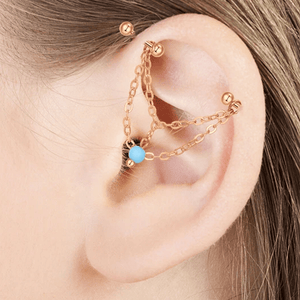 L'or rose symbolise la couleur de l'amour et de la bienveillance. Cette boucle double trou helix apportera finesse et sensualité à votre oreille. Très joli et très fin, ce modèle sera parfait pour affirmer votre beauté. La perle bleu apporte une touche de couleur et est idéale pour les personnes disposant de piercings hélix.