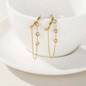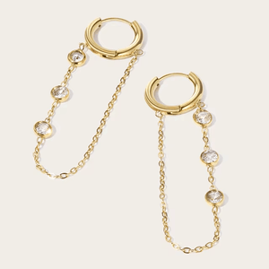 Notre Boucle d'Oreille Créole Pendant combine le charme classique des créoles avec une touche moderne de mouvement grâce à sa chaîne délicatement ornée de diamants de zirconiums. Leur design unique et raffiné apporte une touche de sophistication à toutes vos tenues, qu’il s’agisse d’un look quotidien ou d’une soirée chic.
