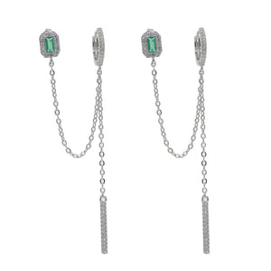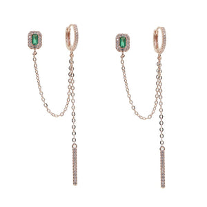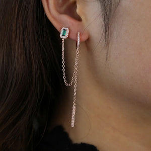 Notre bijou possède une forme atypique composé d'une double attache asymétriqueavec une chaîne pendante mélangeant l'or rose avec une magnifique pierre couleur émeraude.