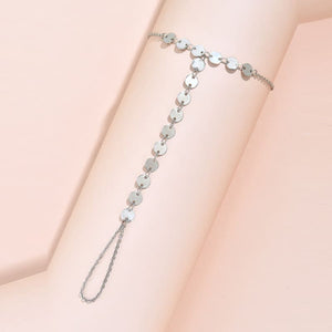 Cette chaîne de main argent est à la fois fine et légère. Très facile à porter, ce bijou élégant peut être porté en soirée comme au quotidien. Sa couleur argentée apportera un éclat de lumière à votre poignet et votre doigt. Avec sa maille disque, ce bracelet avec bague reliée est indémodable.