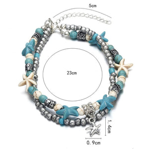 Très estivale, cette chaîne de cheville est composée de perles bleues et des breloques étoiles de mer en argent. L'association du bleu, du blanc et de l'argent crée un mélange rappelant la mer, la plage et les vacances. C'est le bijou de pied incontournable à avoir l'été les pieds dans le sable !