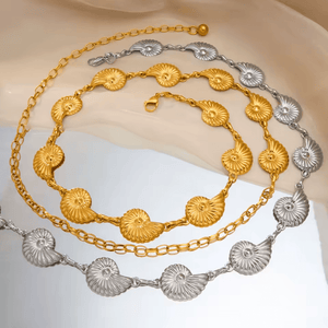 Succombez à l’élégance marine avec cette Chaine de Taille Escargot ornée de pendentifs coquillages escargots en finition or ou argent. Délicate et lumineuse, cette chaîne de ventre épouse parfaitement la silhouette pour sublimer votre look estival, que ce soit en bord de mer ou en soirée.
