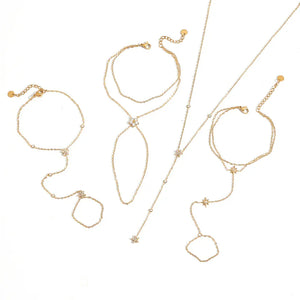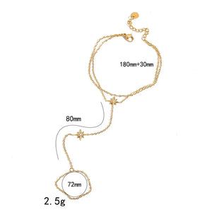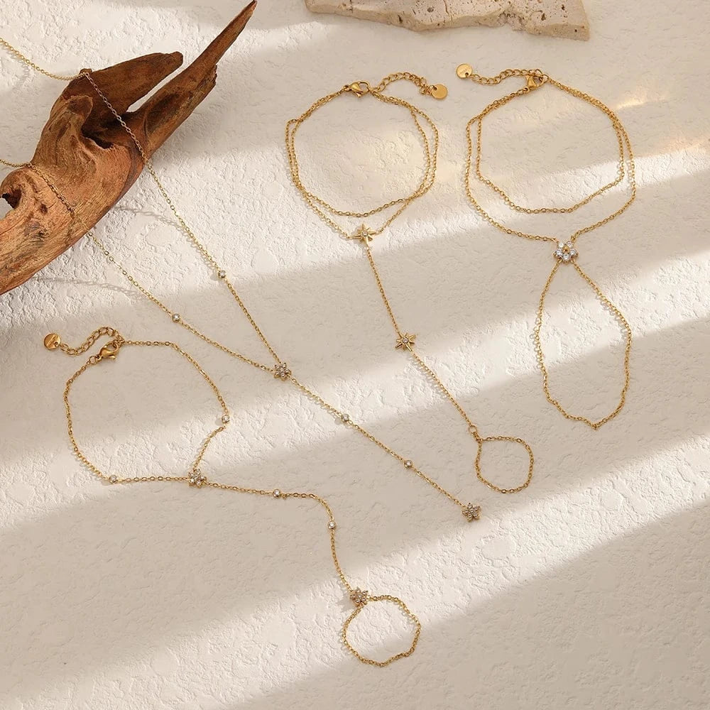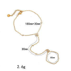 Notre Bracelet de Main Fleur incarne la douceur, la féminité et le charme naturel. Relié à une bague fine par une chaîne élégante, ce bijou de main est sublimé par un motif floral raffiné qui repose délicatement sur le dos de la main.