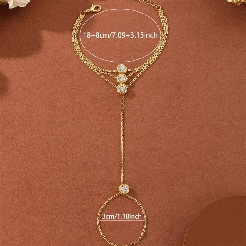 Notre Triple Chaine de Main est conçue pour celles qui aiment les bijoux audacieux et sophistiqués. Avec ses trois chaînes délicatement superposées au niveau du poignet, reliées à une bague fine, elle habille la main d’un effet luxueux et ultra tendance.