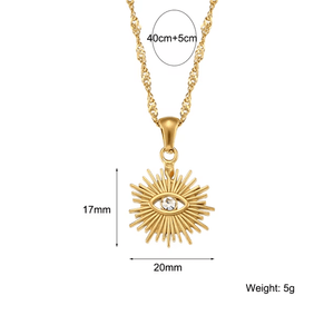Notre Collier Soleil Oeil est bien plus qu'un simple bijou. Il incarne la protection et l'énergie positive avec son design unique mêlant un symbole solaire rayonnant et un œil protecteur. Représentant à la fois la lumière, la force intérieure et la clairvoyance, ce collier chaîne dorée est un accessoire captivant qui attire les regards et éveille la curiosité. Portez-le comme un talisman, ajoutant une touche mystique à votre style tout en renforçant votre aura de confiance et d’énergie.
