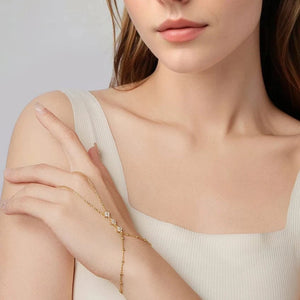 Ce Bijou de Main Argent sublime la grâce naturelle de vos gestes. Reliant délicatement un bracelet raffiné à une bague fine, il dessine une ligne lumineuse sur la main, symbole de féminité et d’élégance intemporelle.