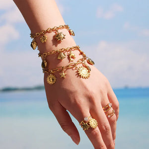 Apportez un souffle marin à votre look avec un Bracelet Charms Coquillage, un bijou chaîne lumineux qui évoque la mer, la liberté et les vacances. Grâce à ses breloques en forme de coquillages, il ajoute une touche naturelle, féminine et délicatement bohème à votre poignet. Un accessoire parfait pour celles qui aiment les bijoux inspirés de la nature et les vibes estivales toute l’année.