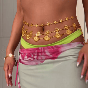 Adoptez un look envoûtant et estival avec nos Chaines de Corps Ventre, disponibles en 3 modèles uniques : coquillage, étoile de mer et soleil. Inspirées par les éléments marins et solaires, ces chaînes sublimeront votre silhouette que vous les portiez ensemble ou séparément.